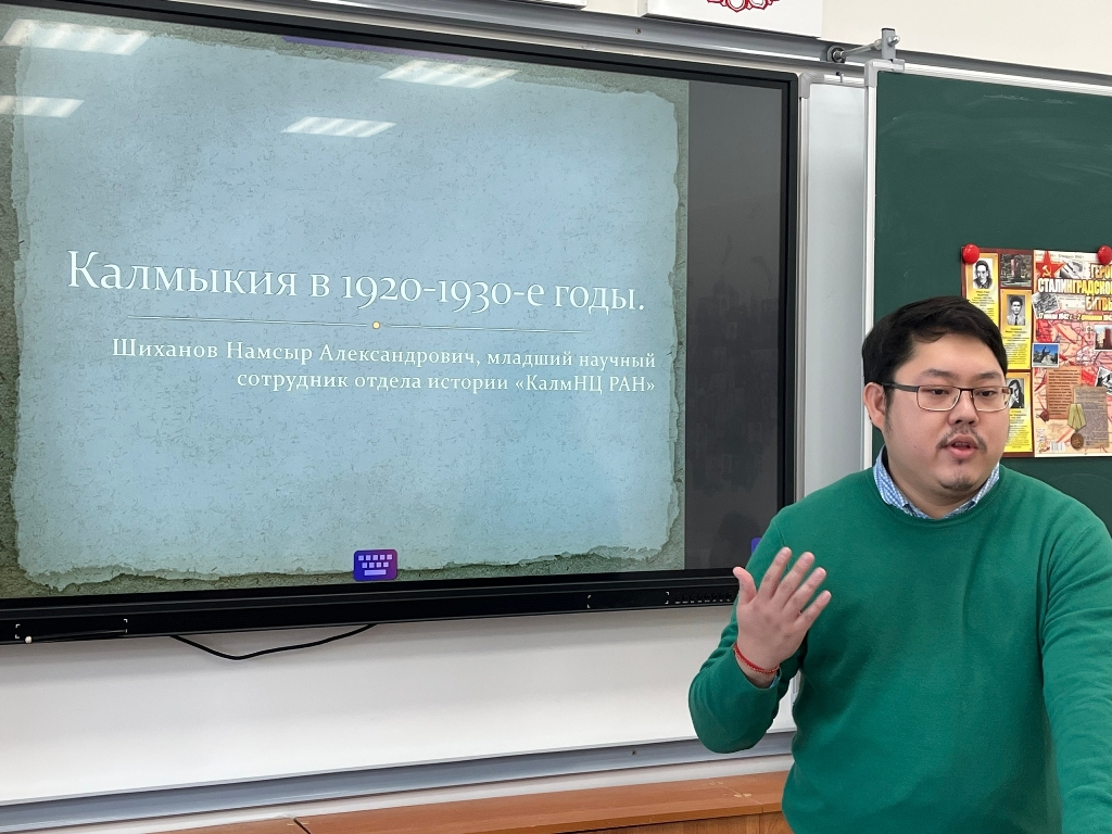 5 февраля младший научный сотрудник отдела истории КалмНЦ РАН Н. А.Шиханов провел лекцию на тему «Калмыкия в 1920-1930-ые гг.» для учащихся 10 «Г» класса Элистинского лицея. Мероприятие было приурочено ко Дню российской науки. Лицеисты ознакомились с малоизвестными страницами истории калмыцкого народа. В ходе оживленной беседы участники затронули вопросы создания Калмыцкой автономии и развития экономики, образования и медицины в предвоенные годы, предшествующие Великой Отечественной войне 1941-1945 гг. Особое внимание привлекли фотографии довоенной Элисты. Отдельные слова благодарности выражаются учителю истории и обществознанию К. Э. Манцевой.
