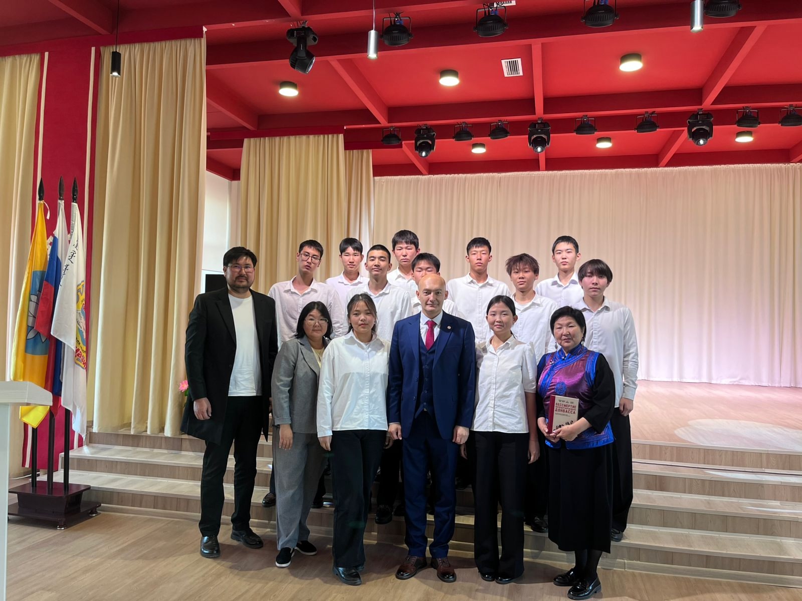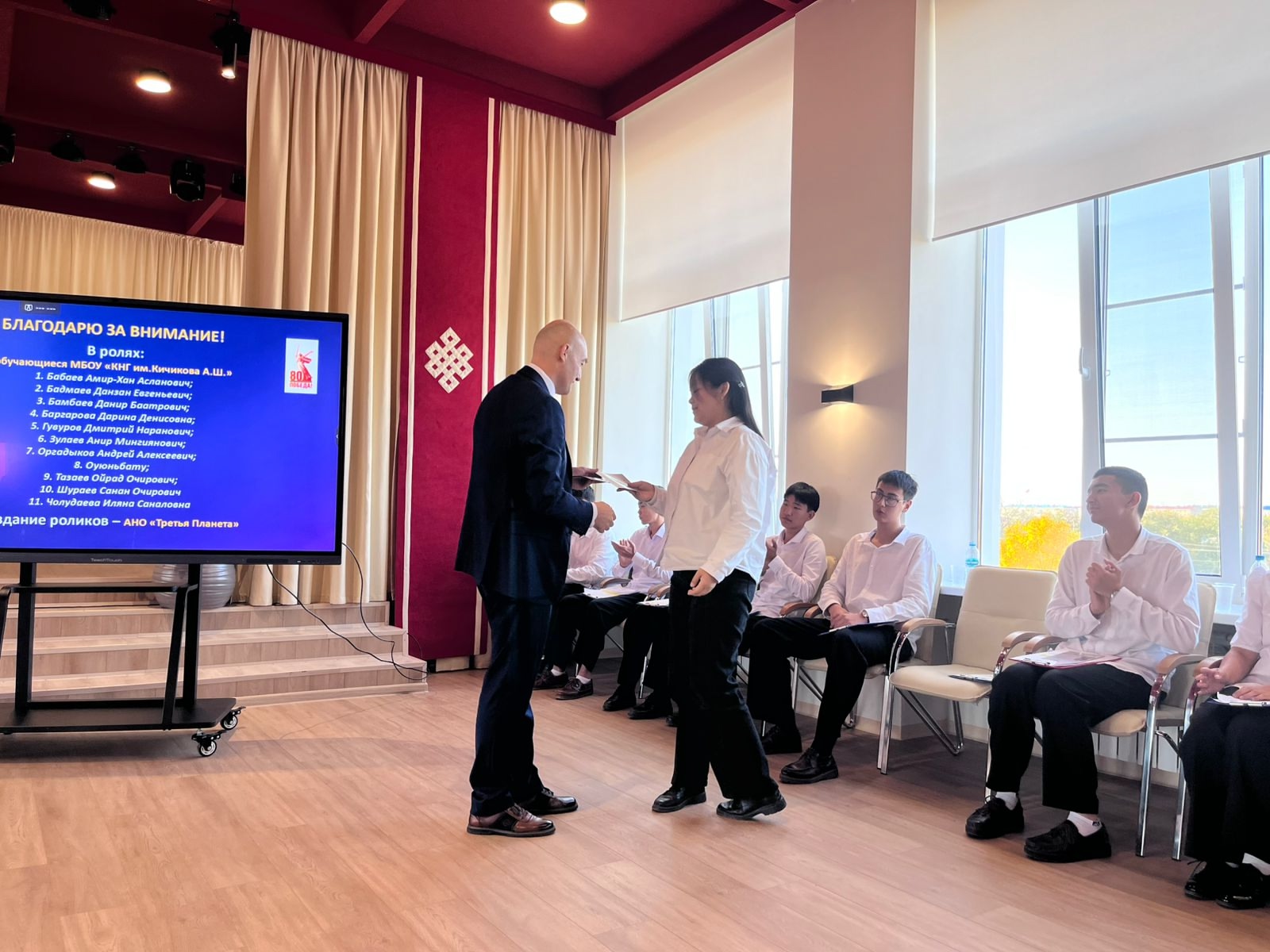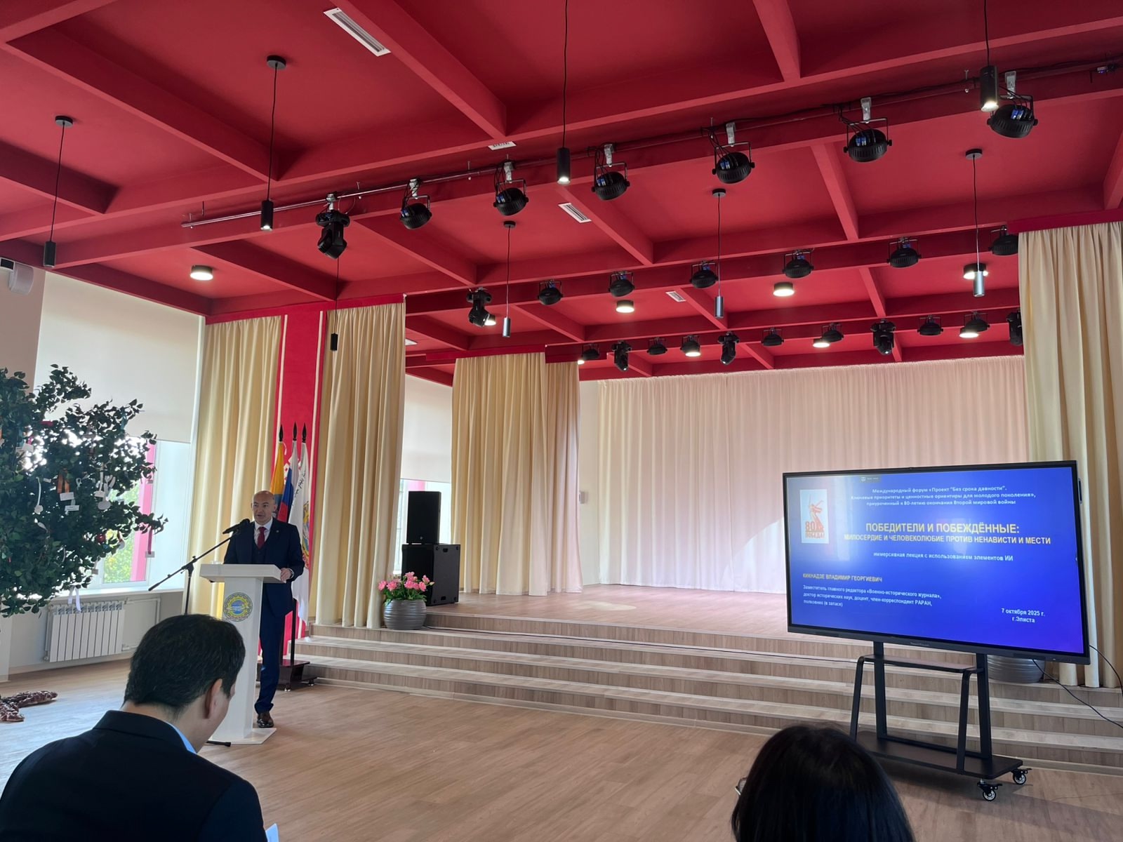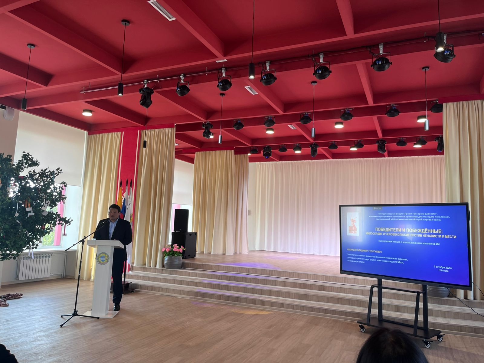 7 октября в Калмыцкой национальной гимназии состоялась иммерсивная лекция с элементами искусственного интеллекта на тему «Милосердие и человеколюбие против ненависти и мести (победители и побежденные во Второй мировой войне)», организованная для старшеклассников гимназии и учителей истории образовательных организаций г. Элисты. Лекцию проводил доктор исторических наук, кандидат военных наук, доцент, полковник, член-корреспондент Российской академии ракетных и артиллерийских наук, заместитель директора Департамента государственной политики в сфере воспитания, дополнительного образования и детского отдыха Министерства просвещения Российской Федерации Владимир Григорьевич Кикнадзе.