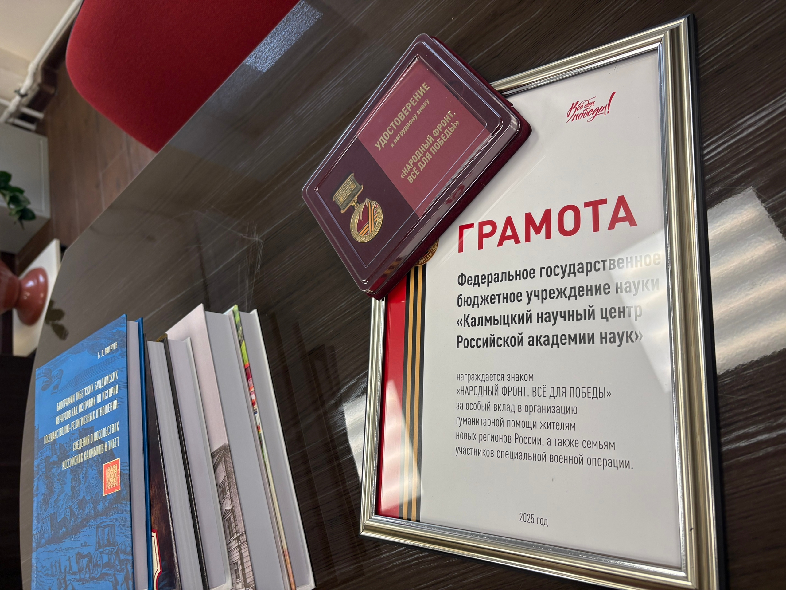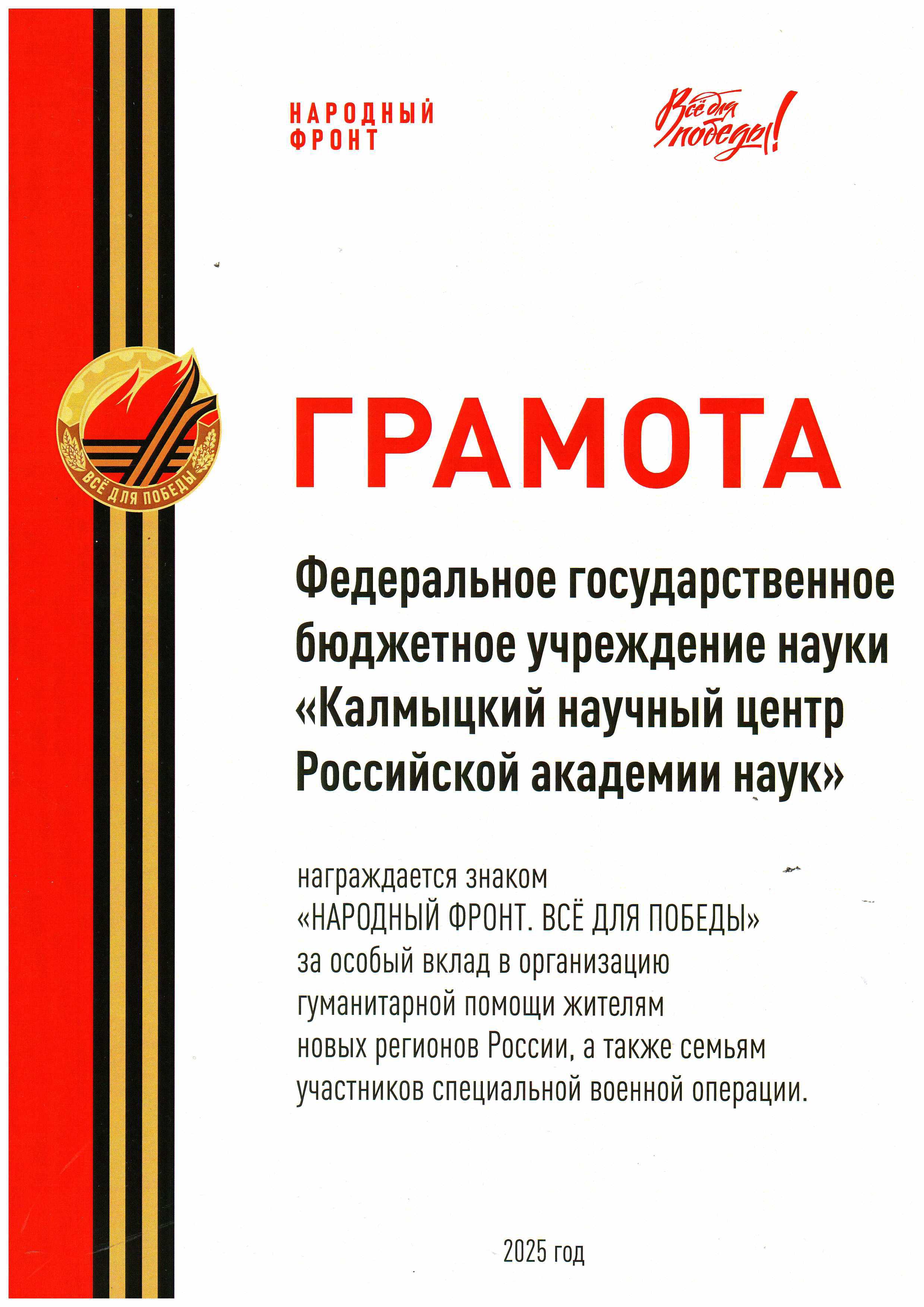 Коллектив КалмНЦ РАН удостоен нагрудного знака «НАРОДНЫЙ ФРОНТ. ВСЕ ДЛЯ ПОБЕДЫ»