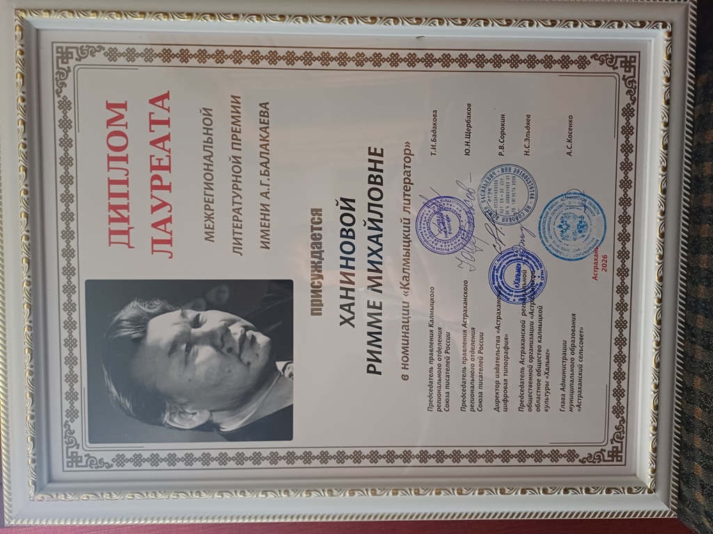 ВЕДУЩИЙ НАУЧНЫЙ СОТРУДНИК КАЛМЫЦКОГО НАУЧНОГО ЦЕНТРА РАН РИММА ХАНИНОВА — ЛАУРЕАТ МЕЖРЕГИОНАЛЬНОЙ ЛИТЕРАТУРНОЙ ПРЕМИИ ИМЕНИ А.Г. БАЛАКАЕВА