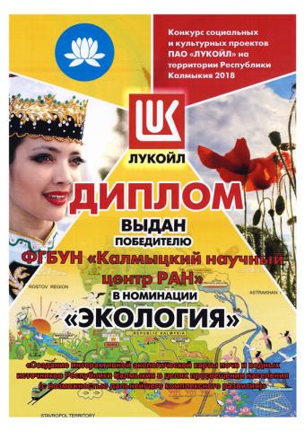 15 сентября 2018 года, в День города Элиста на площади Победы состоялось награждение победителей конкурса социальных и культурных проектов ПАО «ЛУКОЙЛ» в номинациях «Духовность и культура», «Экология», «Спорт», «Молодежные инициативы». В номинации «Экология» победителем стал Калмыцкий научный центр РАН с проектом «Создание интерактивной экологической карты почв и водных источников Республики Калмыкия в целях просвещения населения (с возможностью дальнейшего комплексного развития)». Научному центру