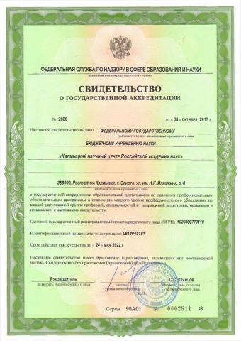 Аспирантура КалмНЦ РАН функционирует на основании лицензии № Л035-00115-08/00096290 от 08.08.2017 г. (срок действия - бессрочно) на право осуществления образовательной деятельности по образовательным программам послевузовского профессионального образования, выданной Федеральной службой по надзору в сфере образования и науки Министерства образования и науки Российской Федерации. С Лицензией можно ознакомиться в Реестре лицензий на сайте Федеральной службы по надзору в сфере образования и науки Министерства образования и науки Российской Федерации.