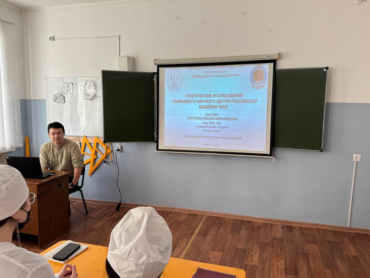 5 февраля 2026 г. на базе школы №18 г. Элисты сотрудником лаборатории генетических исследований Калмыцкого научного центра РАН Саналом Владимировичем Джагруновым была проведена лекция на тему «Багатуты и олёты: в поисках ушедших ойратов (история и генетика)» для учащихся 11 «Б» класса. Мероприятие было приурочено ко Дню российской науки и Неделе естественно-научных дисциплин, проводимой в школе. Учащиеся ознакомились с новейшими изысканиями калмыцких исследователей.
